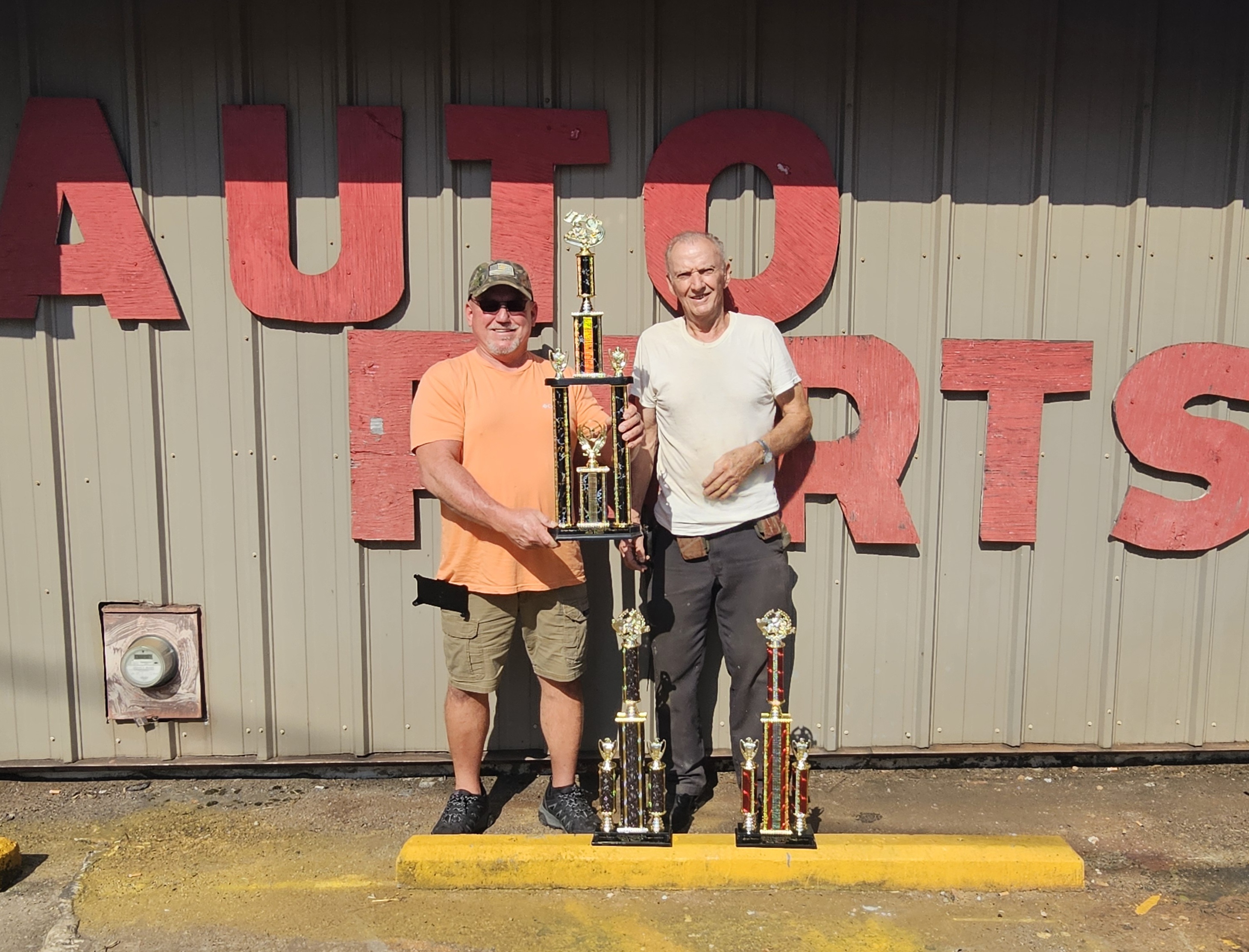 Frank Thweatt Getting his trophies from Dan Scoggins trophy #1 first place Pro Gas trophy # 2 first place Modified-Open and the big one Frank is holding is SENIOR TRACK CHAMPIONSHIP WINNER---- ( photo taken at Scoggins Auto Parts in Atlanta)
